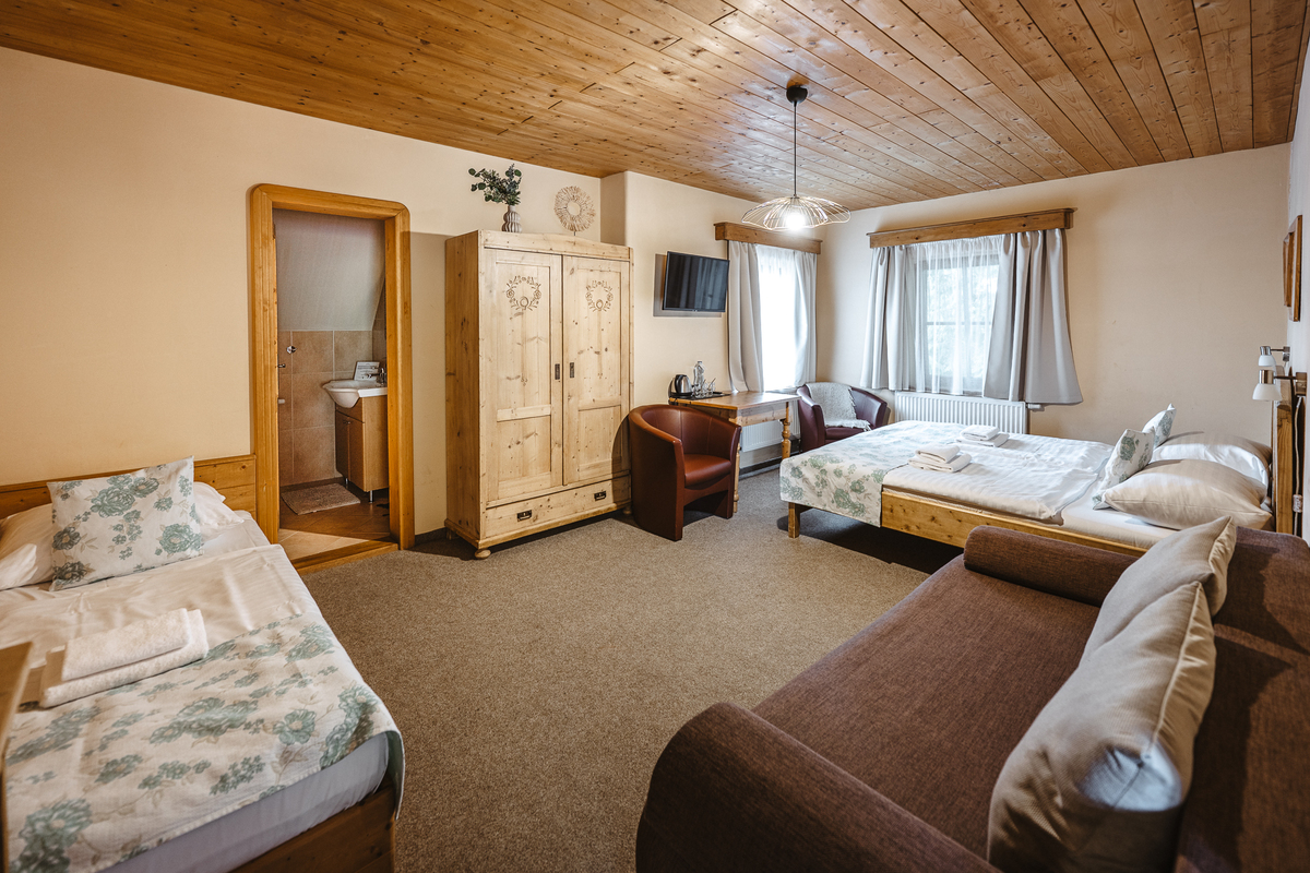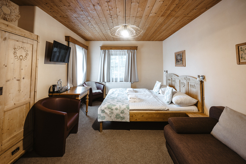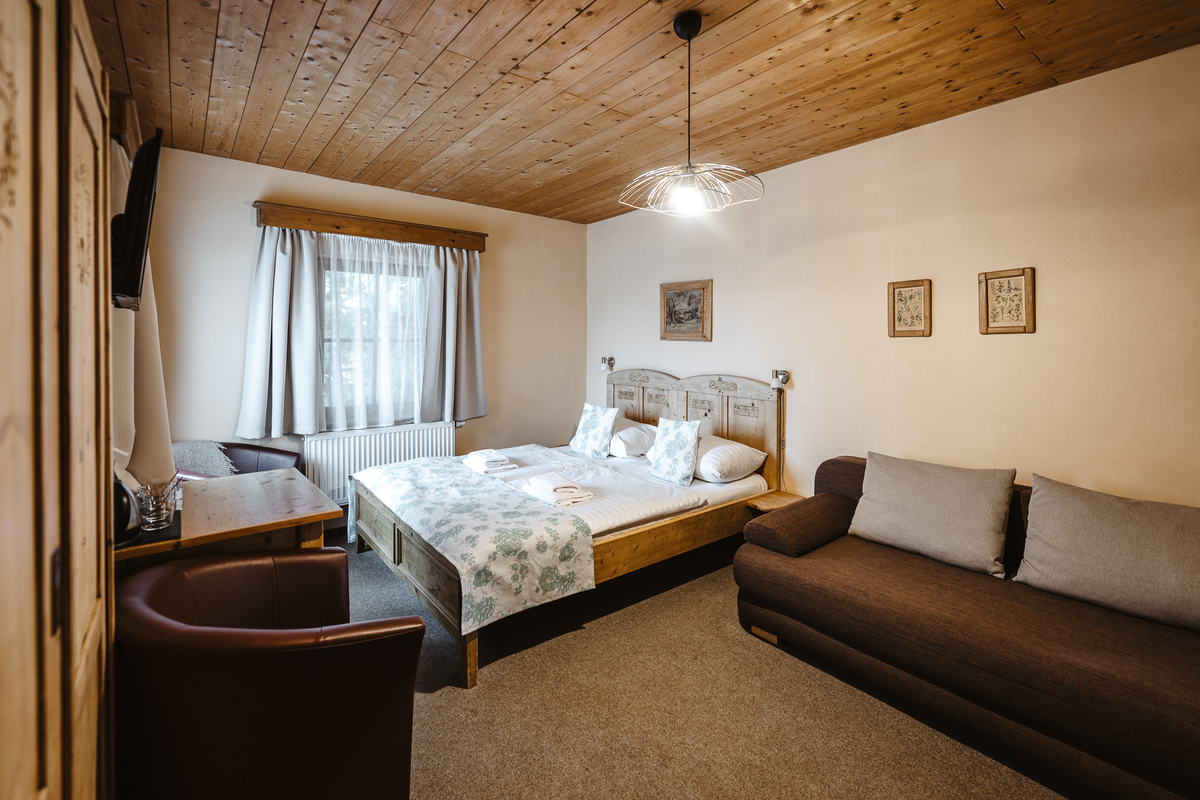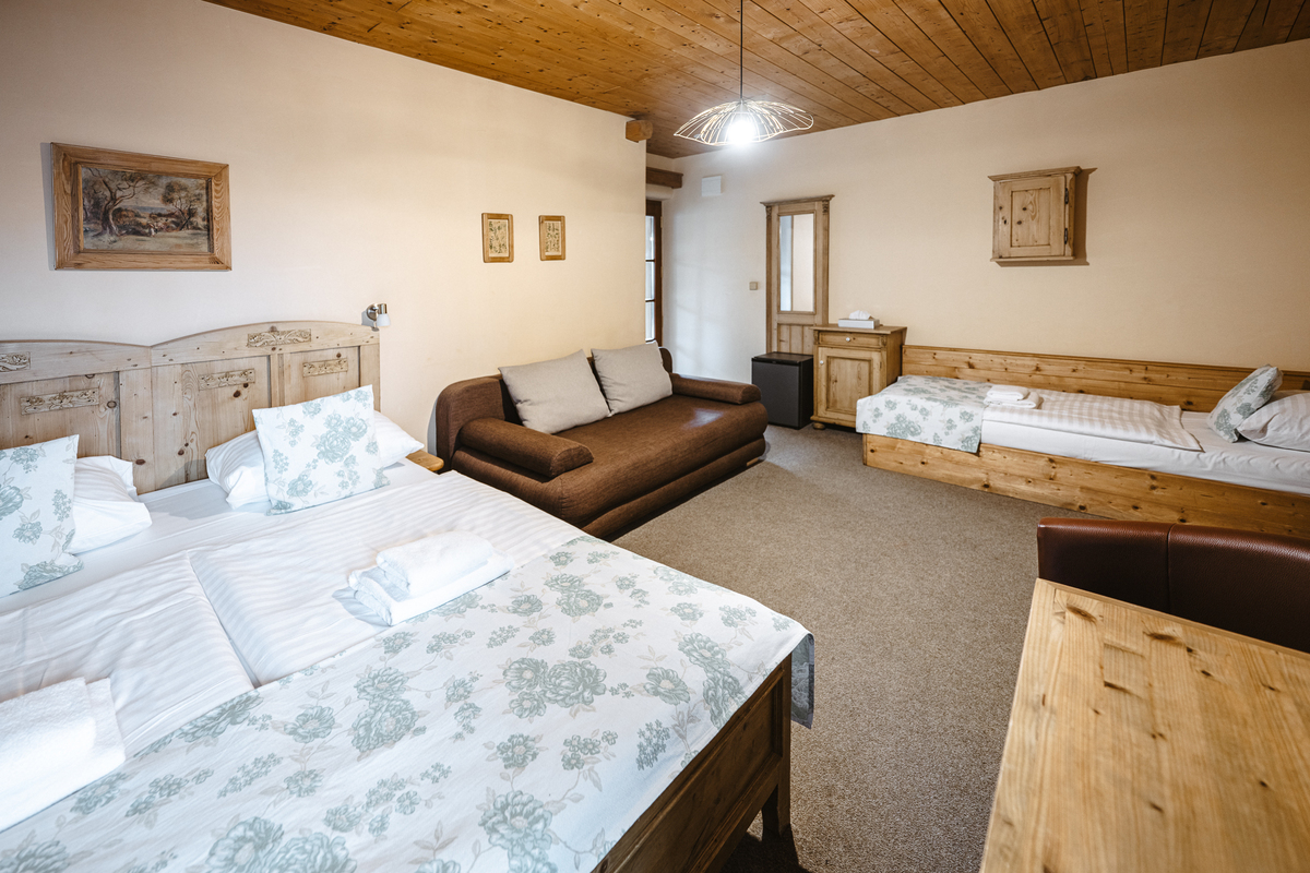 This room is suitable for a family with small children. If you would like a better comfort, reserve a Premium room or one of our Suites.We pamper all our guests with shower gels and shampoos of the first-class Czech brand MIBIO cosmetics. With 100% natural ingredients, without silicones, alcohols and perfumes. In the rooms you will find refill bottles, which we refill regularly with respect to the environment. We offer cosmetics for sale to go at our hotel reception.